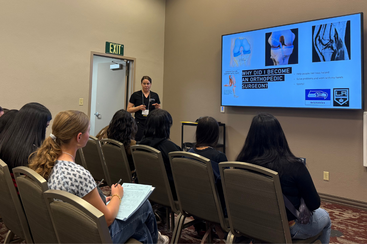 In one classroom, orthopedic sports surgeon Dr. Becky Griffith laid out power tools and artificial joint samples on a table, inviting students to try suturing techniques.
