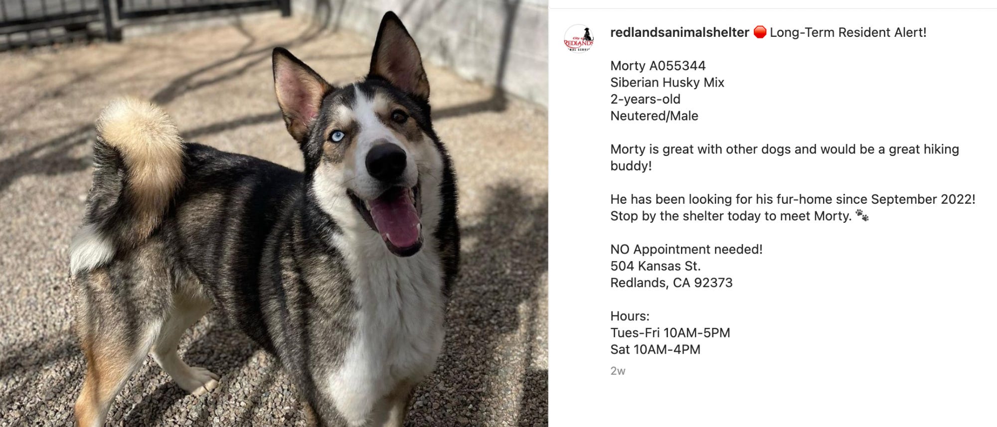 Pet adoptions are listed on 24 Pet Connect. (Enter the zip code 92373 to view pets available from the Redlands Shelter).
