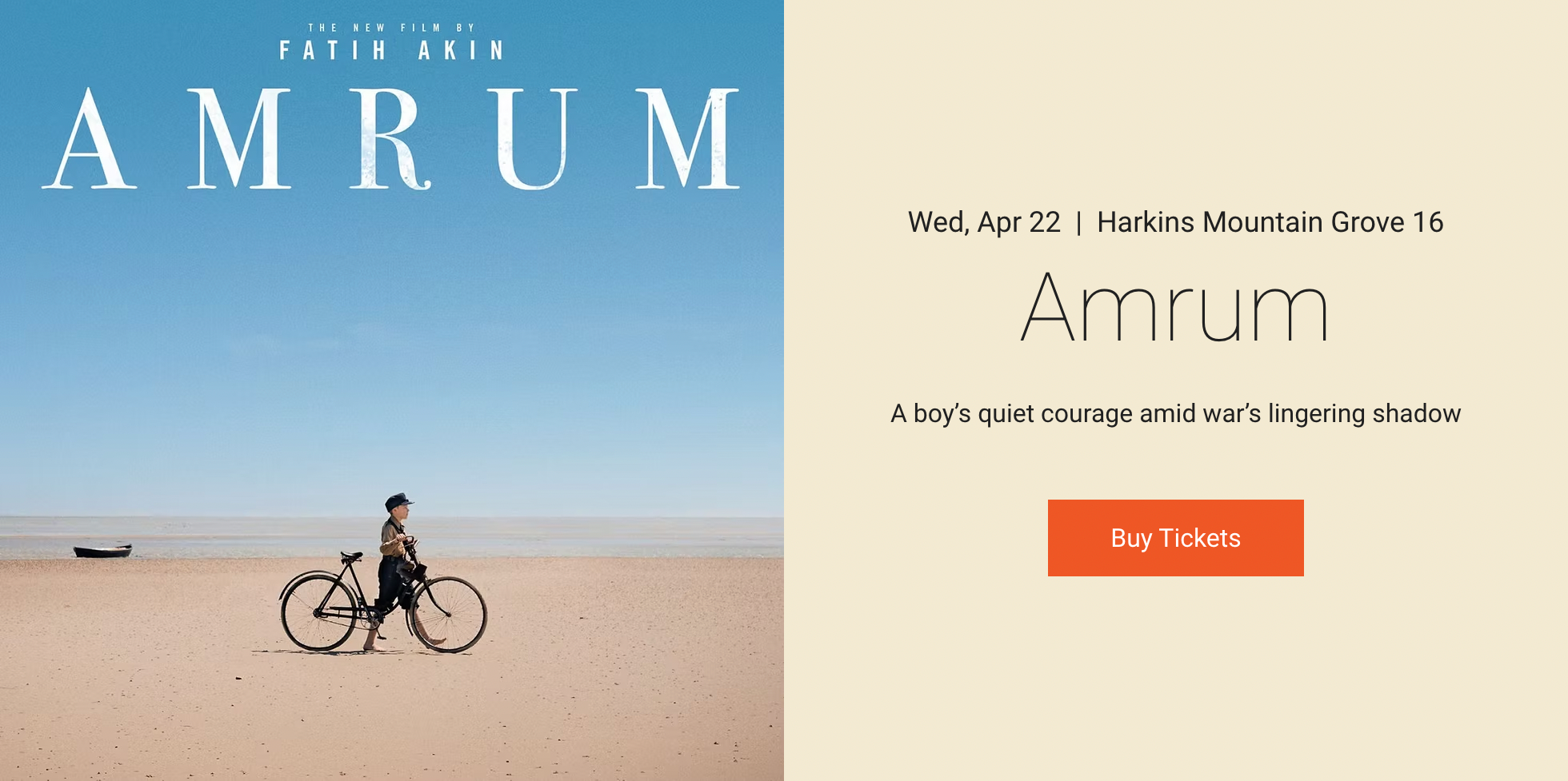 The fourth film, Amrun, screens April 22–23. Directed by Fatih Akin, the German drama is set in 1945 on a North Frisian island and follows a 12-year-old boy struggling to care for his family as World War II comes to an end. The film premiered at the 2025 Cannes Film Festival and has been shortlisted for a 2026 Oscar nomination.