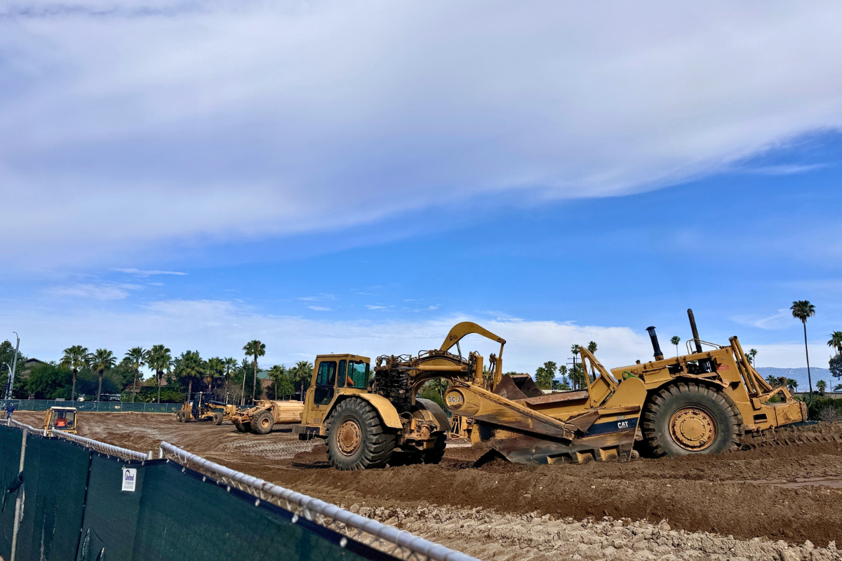 Photos taken this week show grading activity across the fenced site, with large earthmovers reshaping the lot and preparing foundations. The property, previously vacant, sits at a prominent downtown intersection and is one of the first major developments tied to the city’s Transit Villages Specific Plan.