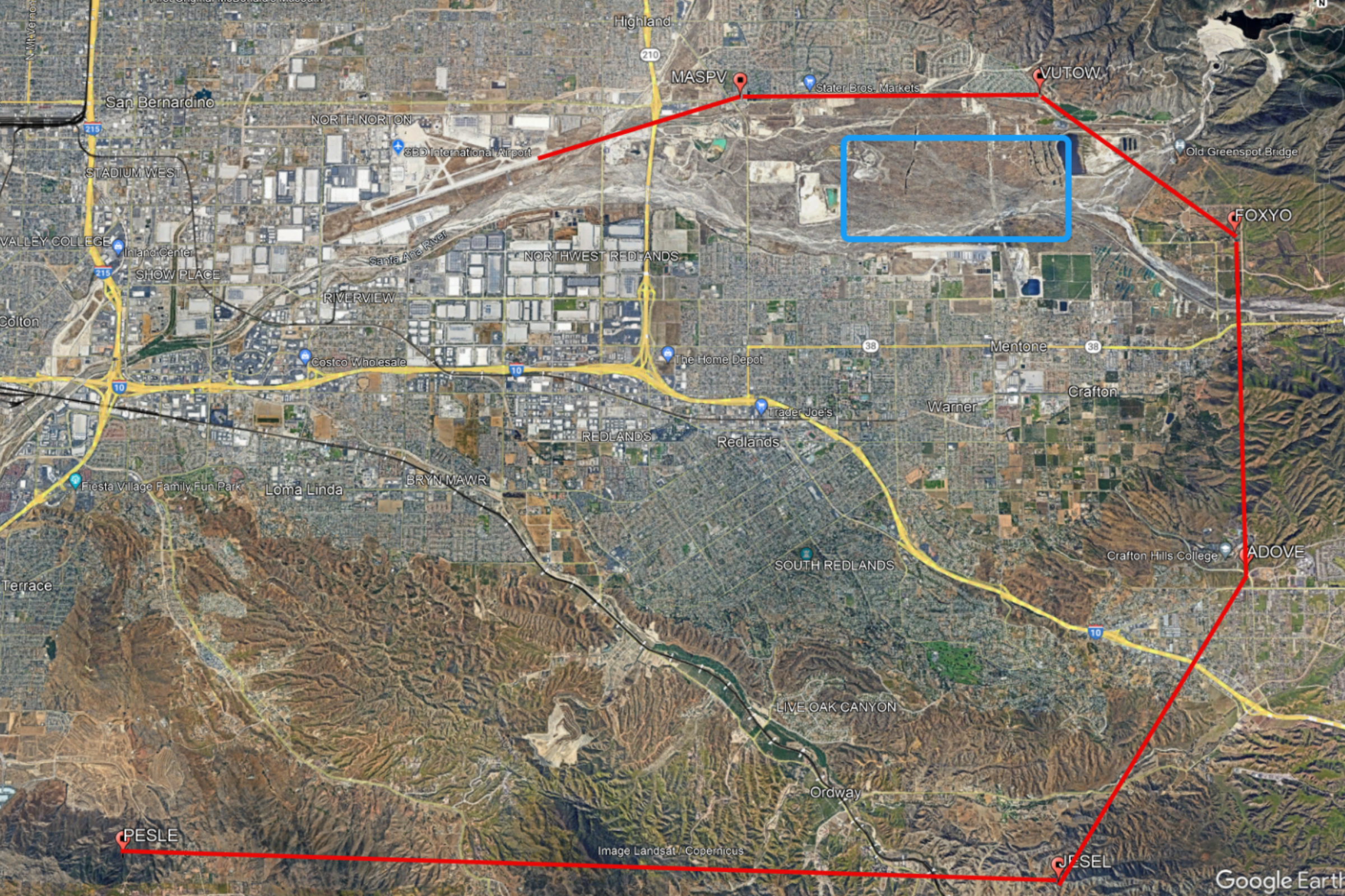 A video explaining flight procedures at SBD airport notes that the route was developed to avoid airspace over Redlands Municipal Airport, an aerobatic flight field, and the mountains.