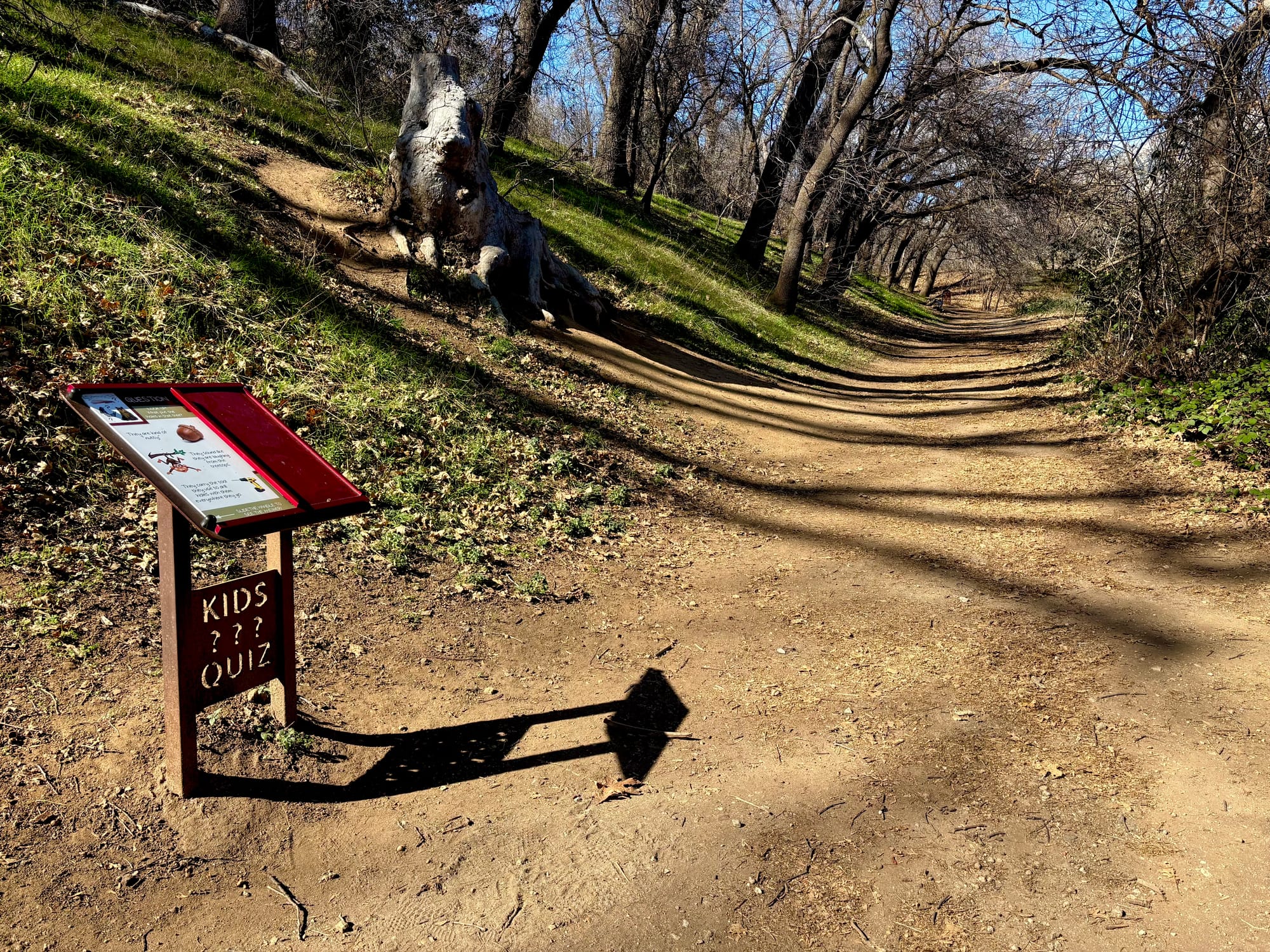 There are signs for learning about the plants and different kinds of ducks along the way. For little hikers, there are "Kids Quiz" posts. At one point there’s a little creek with a waterfall and a small bucket with an invitation to water the trees.