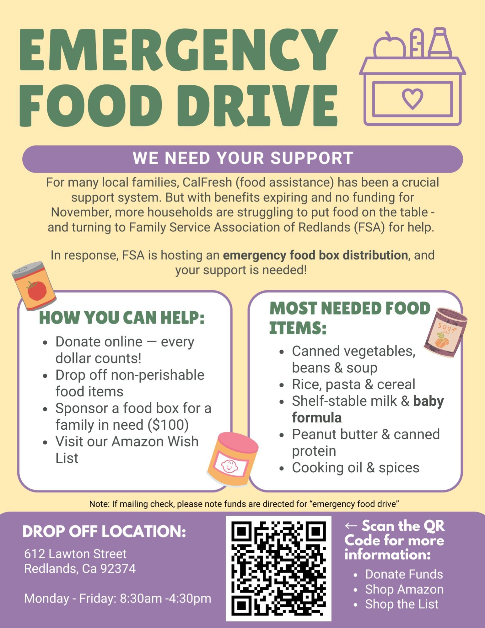 In response, FSA will host two free, no-registration Emergency Food Box Distribution at its Redlands campus (612 Lawton St.) next week.