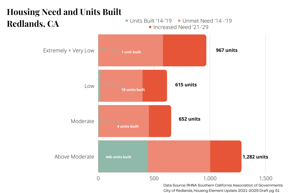 The need for low-income housing in Redlands is rising at a higher rate than for higher-income housing. Yet in the last housing cycle, only 19% of the projected housing need was met. The vast majority of units were built for the above-moderate income category.