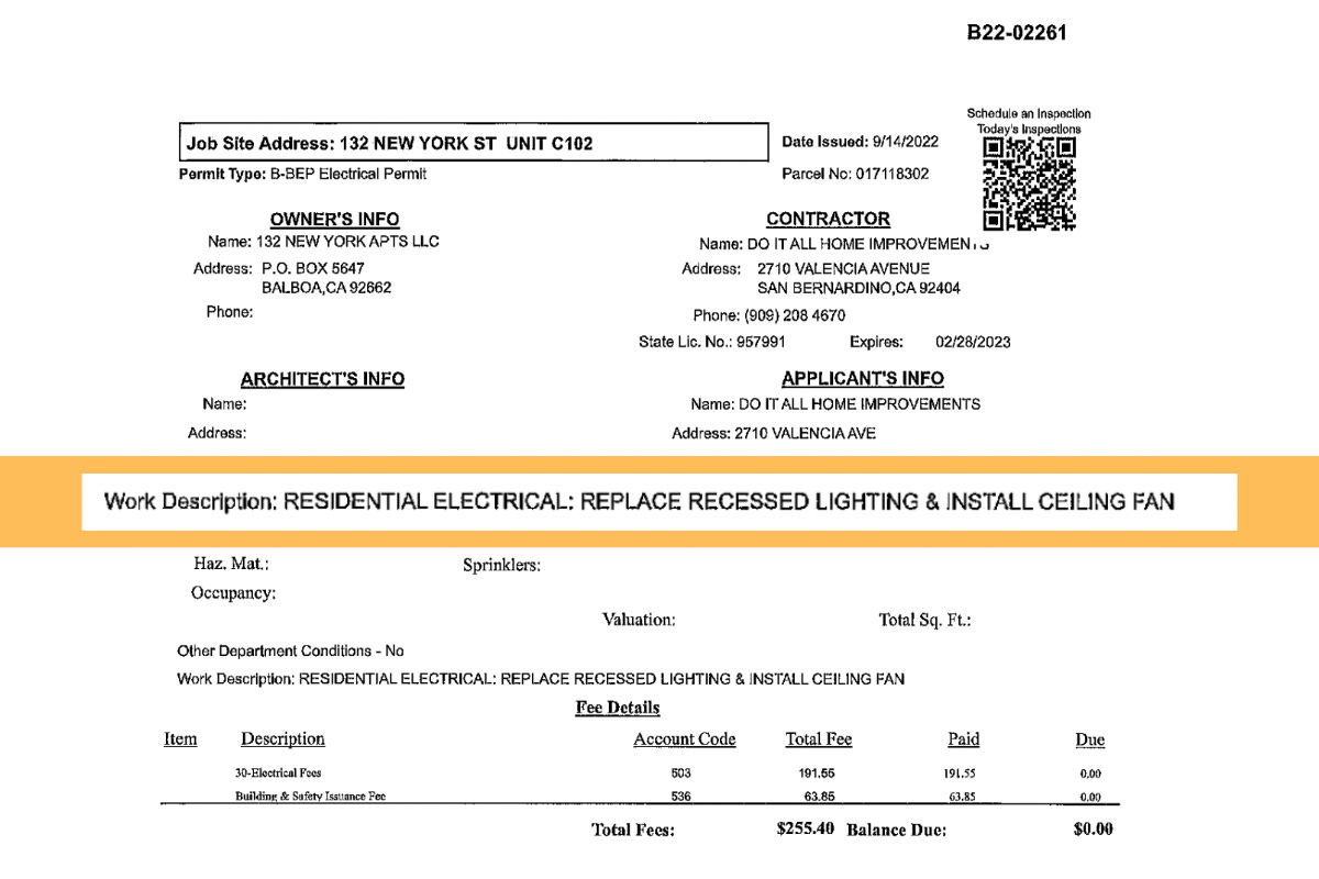 The scope of work listed on the permits includes the installation or replacement of recessed lighting and ceiling fans.