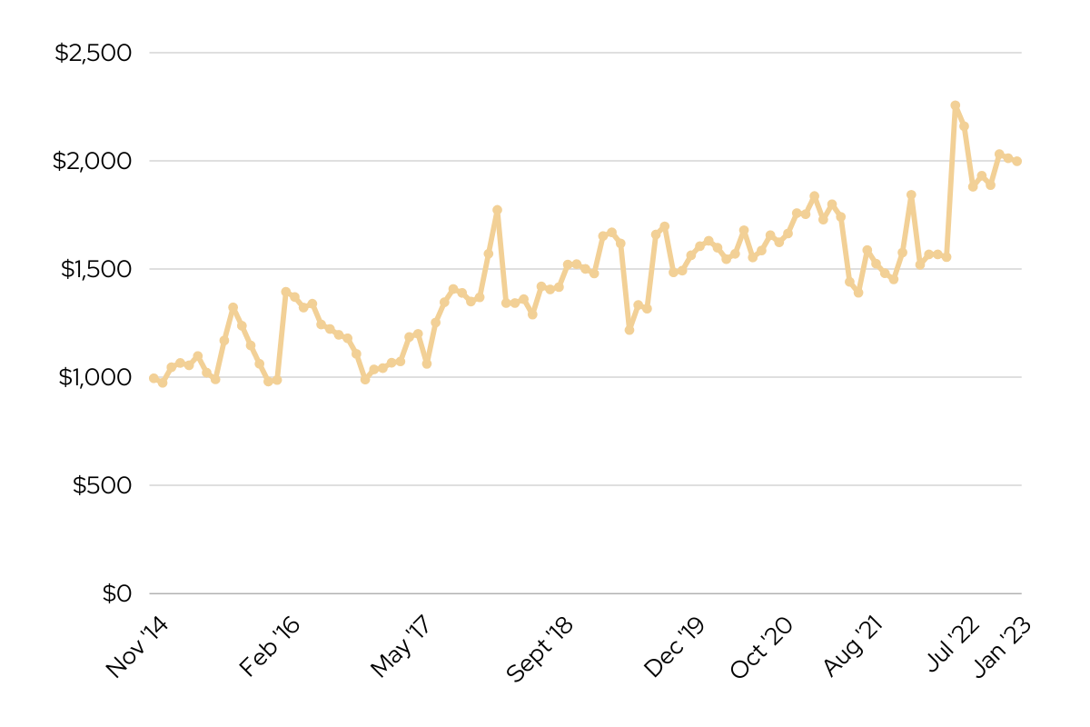 Rental prices in Redlands for a 1-bedroom apartment have nearly doubled since 2014 according to data from Zumper.