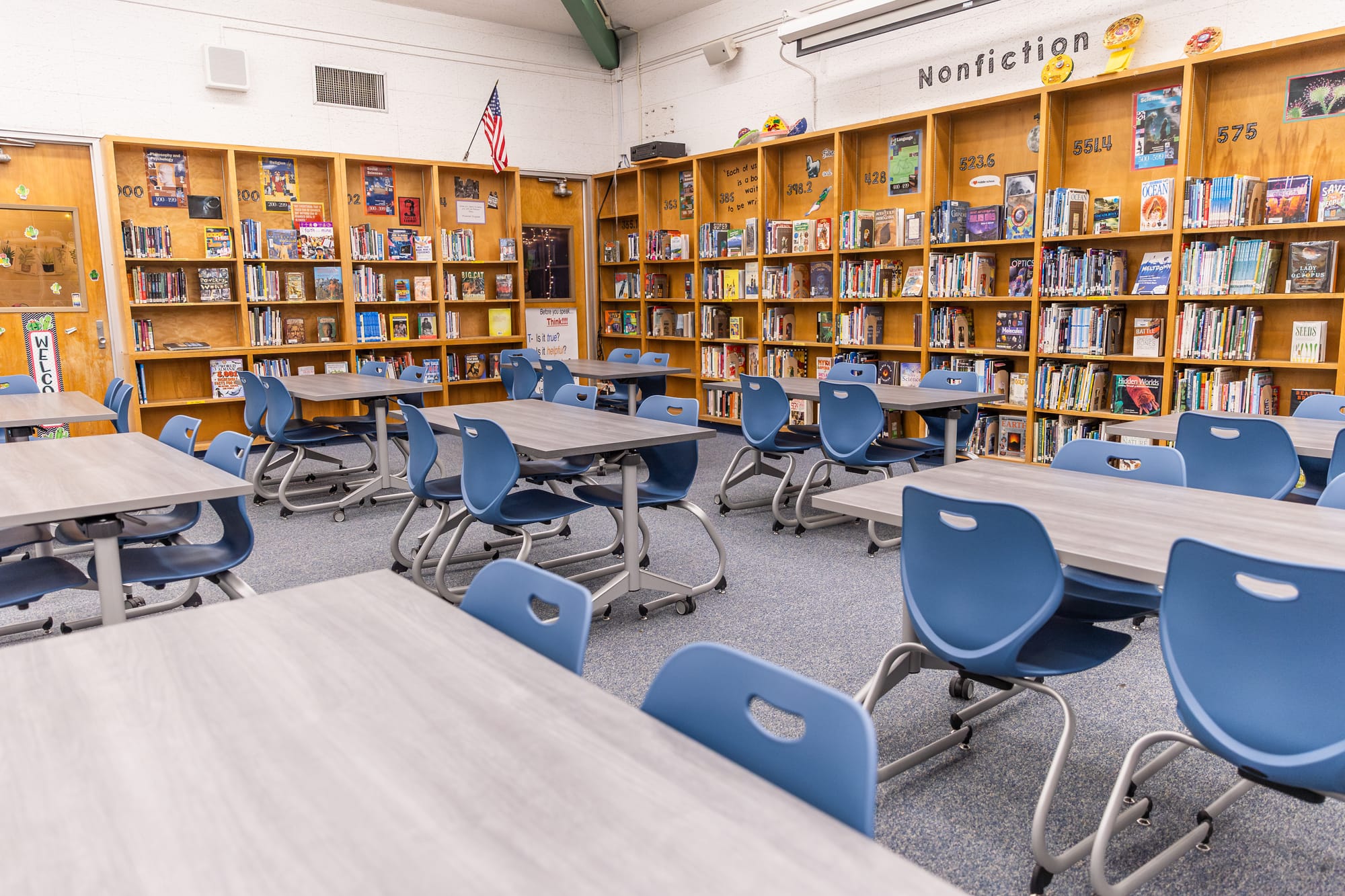 Librarian Jenann Elias recently entered a contest sponsored by KI Furniture and, with the public’s help, garnered more than half of the 111,000 total votes. She designed the layout herself and selected the chairs, tables, and soft seating in calming shades of blue and gray. The tables are on casters, making them mobile and allowing teachers and Elias to adjust the area to fit the needs of the current class or activity.