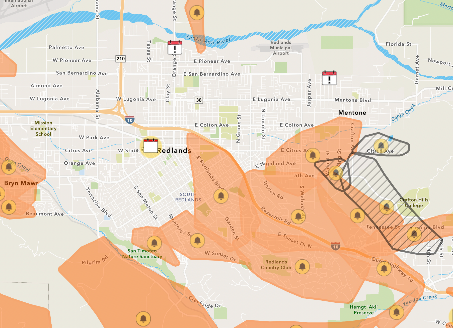 Public safety power outage warnings were issued across south Redlands on Sunday morning. Areas shaded with orange indicate a warning, while areas with black stripes have the power shut off.