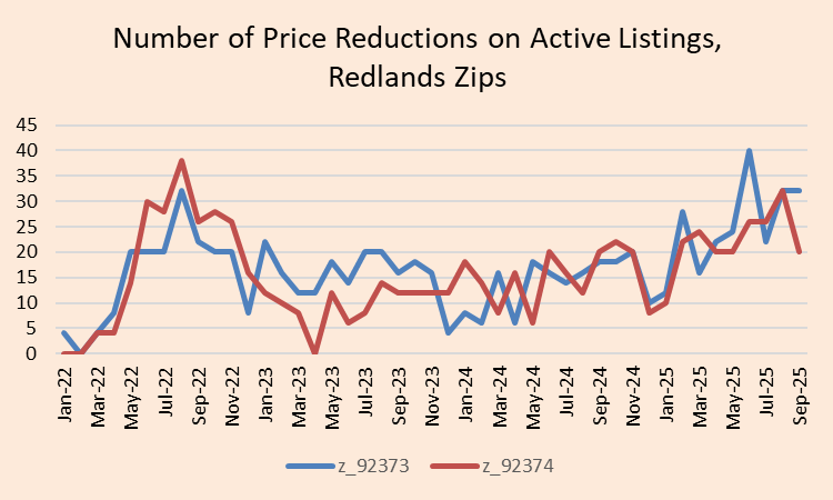 Further evidence of downward price pressures comes from the number of price reductions on active listings, which Realtor.com counted at 32 in 92373 and at 20 in 92374 - metrics that have gradually increased since early-2024.