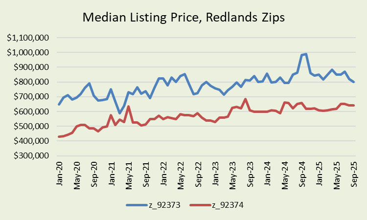 Median listing prices were just shy of $800,000 in 92373 and $641,000 in 92374.