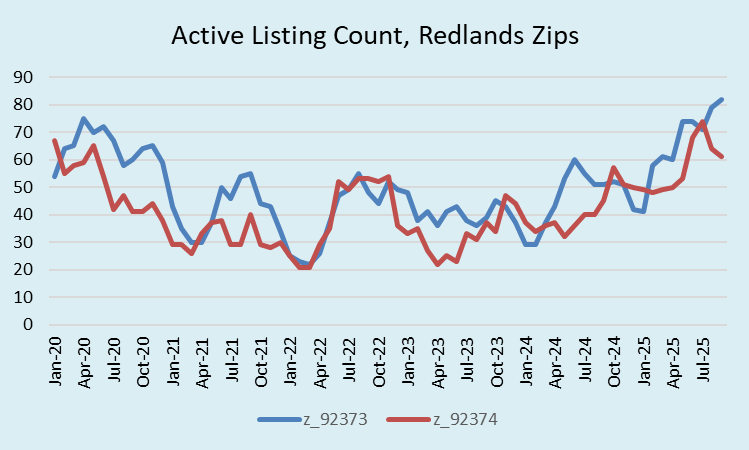 Regionally, the big news is the spike in inventory, which Realtor.com measures by counting the number of active listings in a given month. Since early 2024, inventory has climbed in 92373 and 92374 at an astonishing pace.