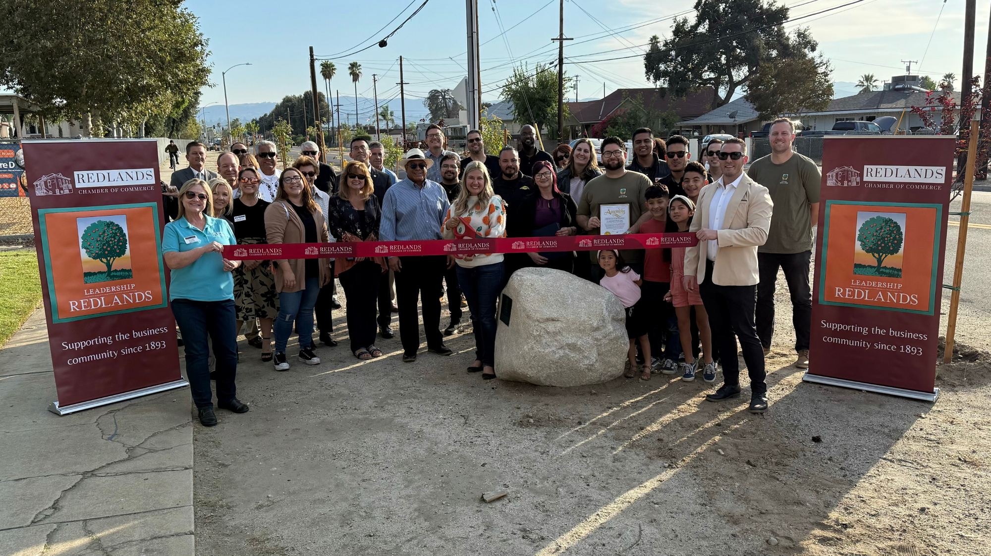 The Redlands Chamber of Commerce Leadership Redlands class of 2023 gathered with Redlands Unified teachers and staff and the community to celebrate a successful community project that led to dozens of new trees outside Lugonia Elementary.