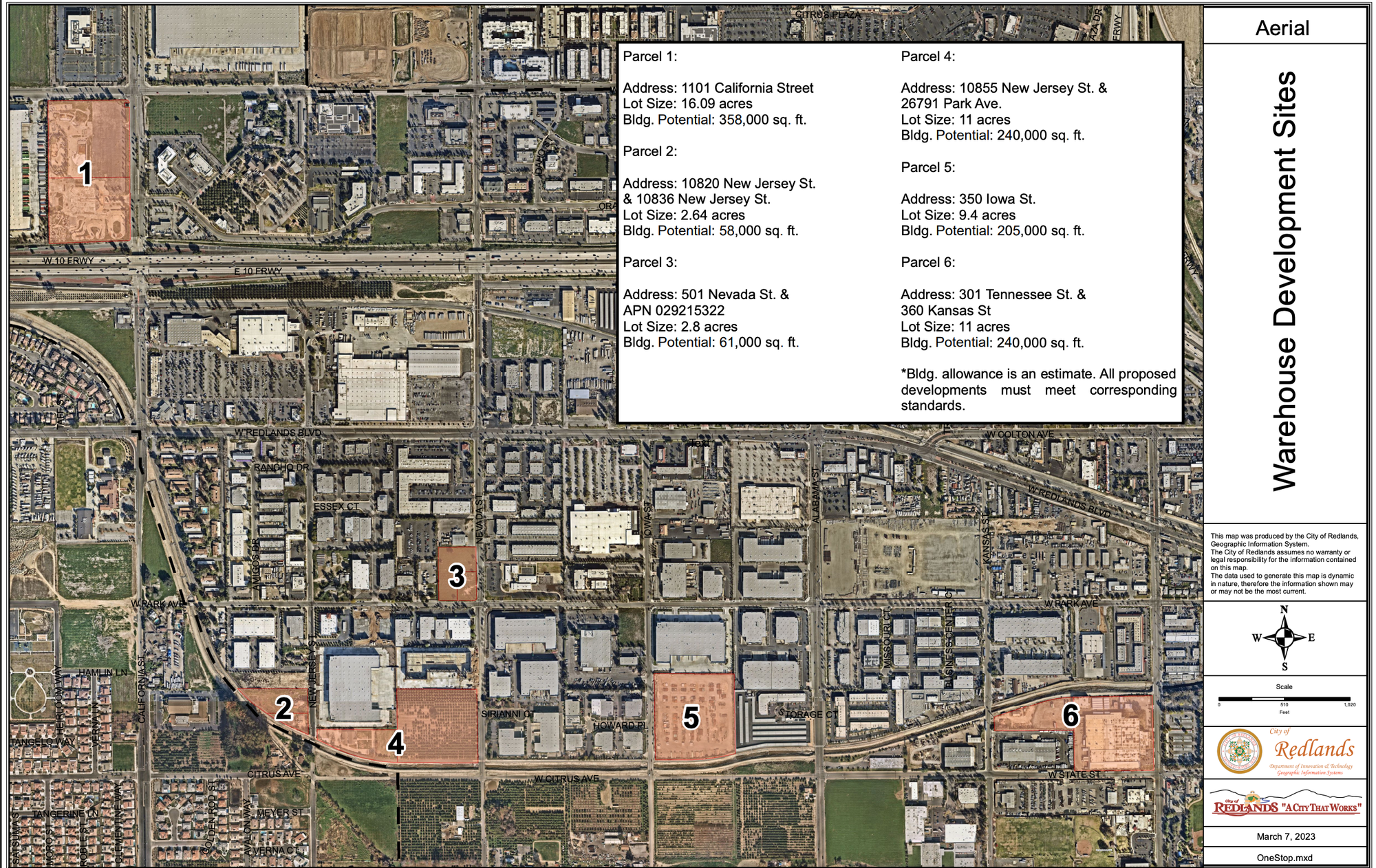 Planning staff presented six parcels previously identified as the largest undeveloped or underutilized warehouse-zoned sites in Redlands. Of those: