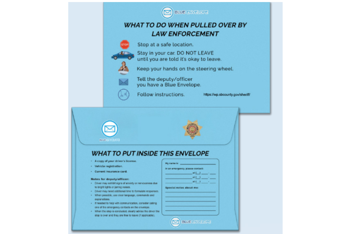 Participants can place important documents—such as a driver's license, registration, and insurance—inside a clearly marked blue envelope, which can also include notes to guide officers on how best to communicate with the driver or passenger.