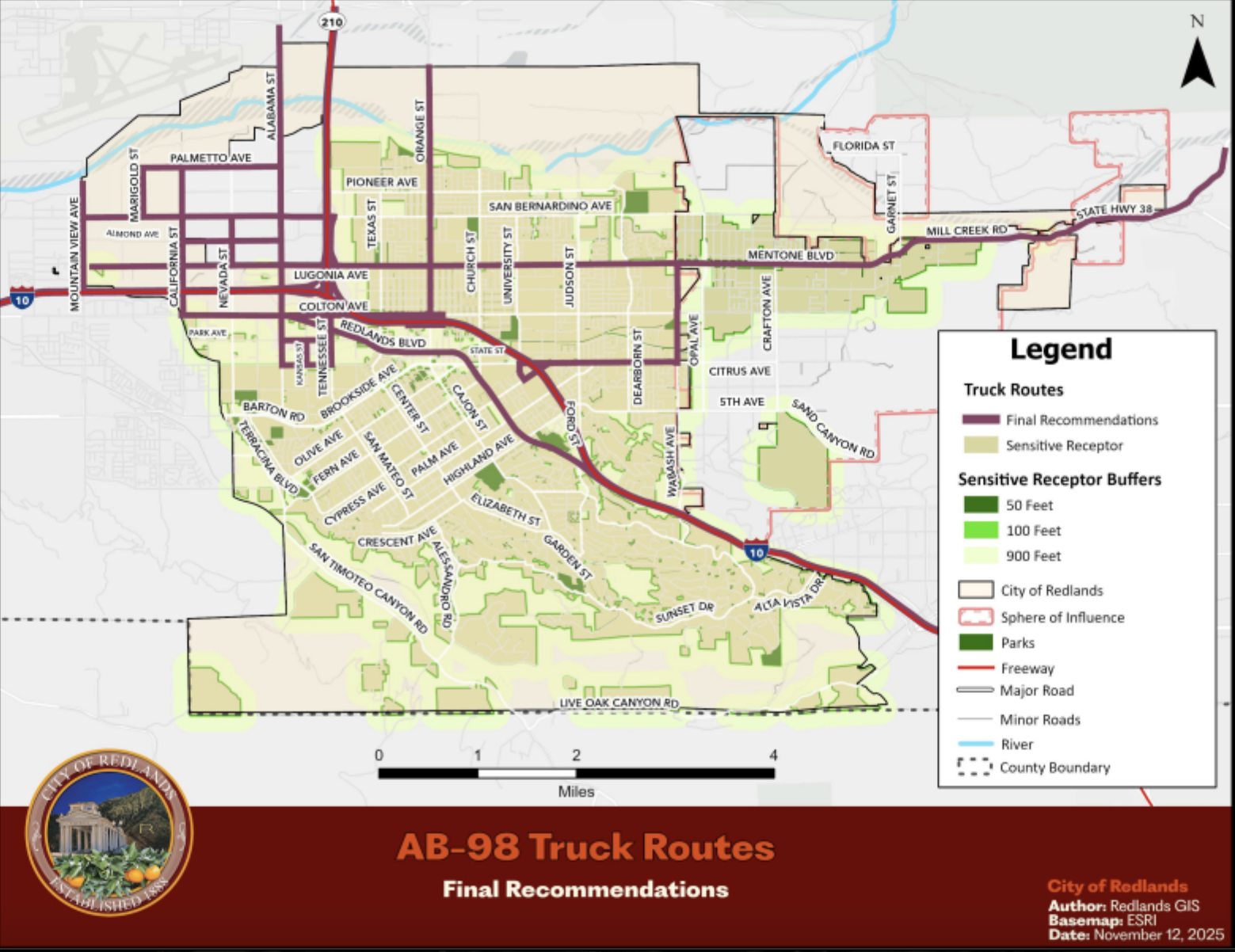 Redlands’ current truck route map was adopted as part of the city’s 2035 General Plan. The updated map is intended to bring the city into compliance with AB 98, which was signed into law Sept. 29, 2024.