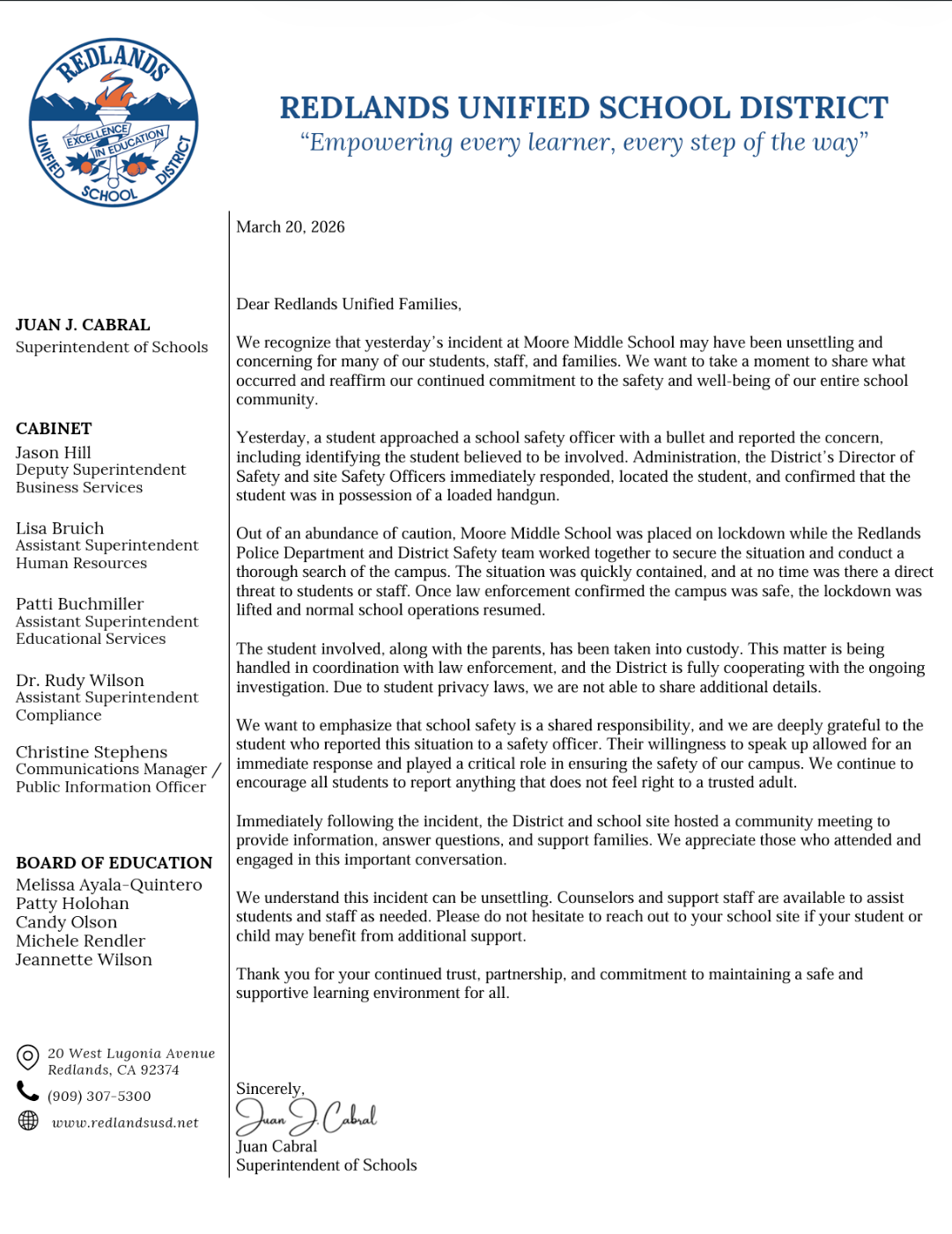 REDLANDS, Calif. — In a letter to families Friday, Redlands Unified School District Superintendent Juan Cabral addressed the discovery of a loaded handgun on the Moore Middle School campus and emphasized that school safety is a shared responsibility.