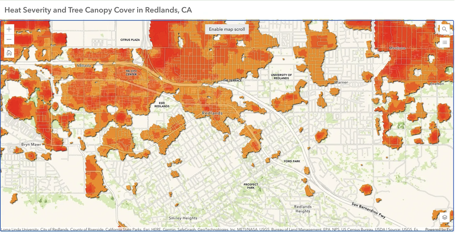 The dark red areas in North Redlands that are “severely” above the city’s average temperature have less canopy cover.