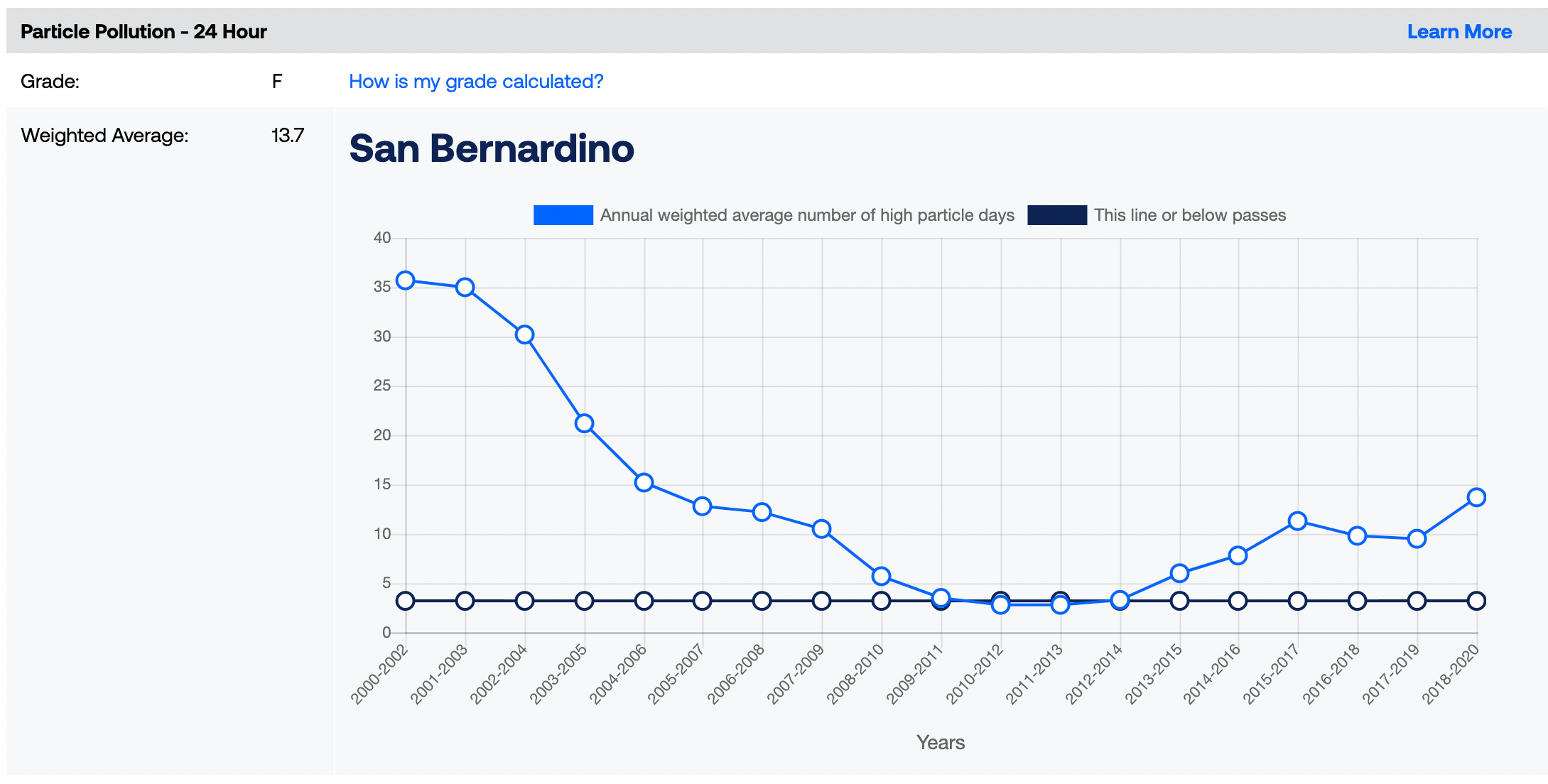 According to the American Lung Association, the San Bernardino area has some of the worst air quality in the United States with a failing grade for both ozone and particle pollution. According to their data, after years of improvement, the air quality in the region has worsened since 2015.