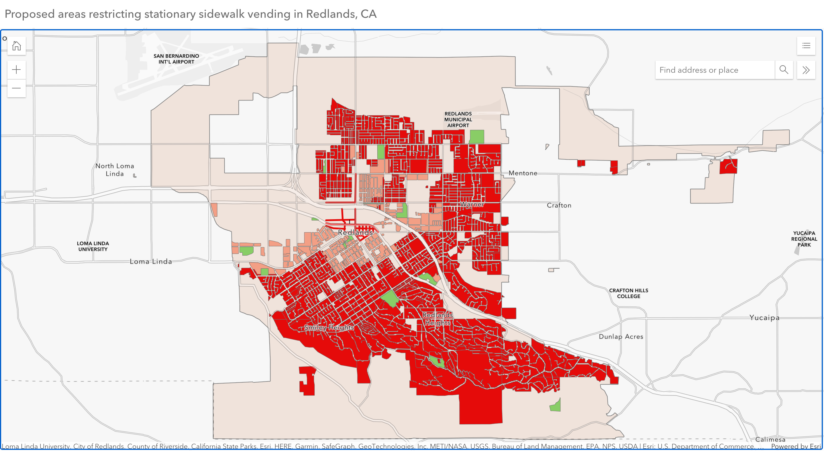 Additionally, no vending is allowed within 500 feet of certain events, like Certified Farmers Markets, or 30 feet of other vendors or locations like schools, bus stops, or train stations. Finally, vendors are not permitted on "Business Area Sidewalks," which includes most of downtown Redlands and Orange Street to Lugonia.